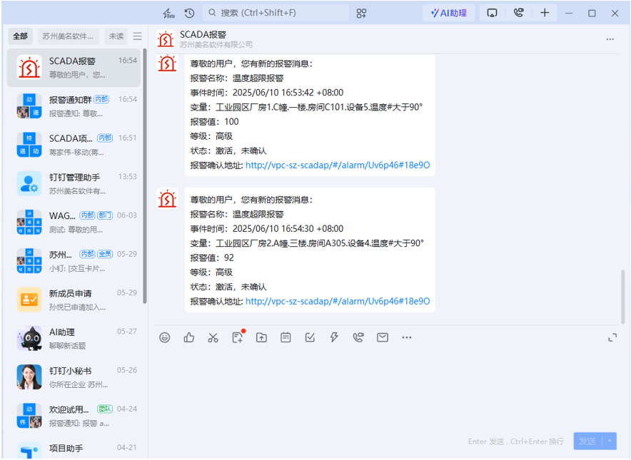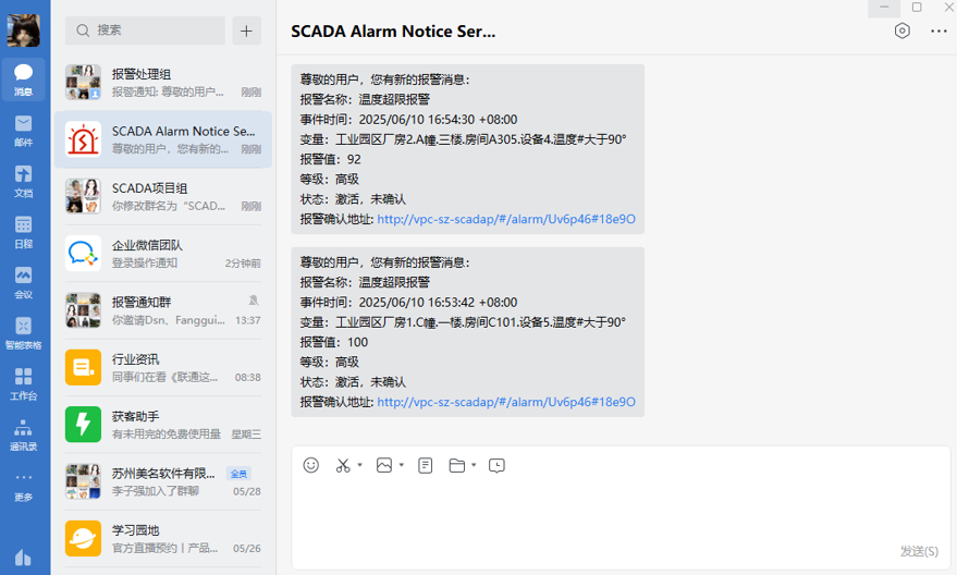 系统支持通过企业微信与钉钉发送报警信息,全面打通主流办公通讯平台,逐步提升运维效率与响应速度,满足工业现场报警通知的及时送达要求: